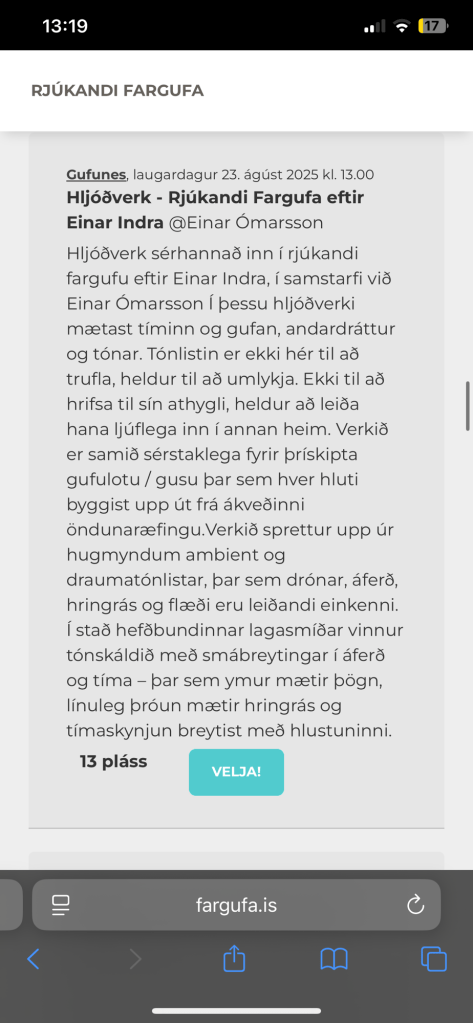 Posted on August 20, 2025August 20, 2025Hljóðverk á menningarnótt https://www.instagram.com/reel/DNbIlLWoF6Y/?igsh=czIxb2w1MW94ZDZn View this post on Instagram A post shared by E I N A R _ G U S A R (@einar_gusar)